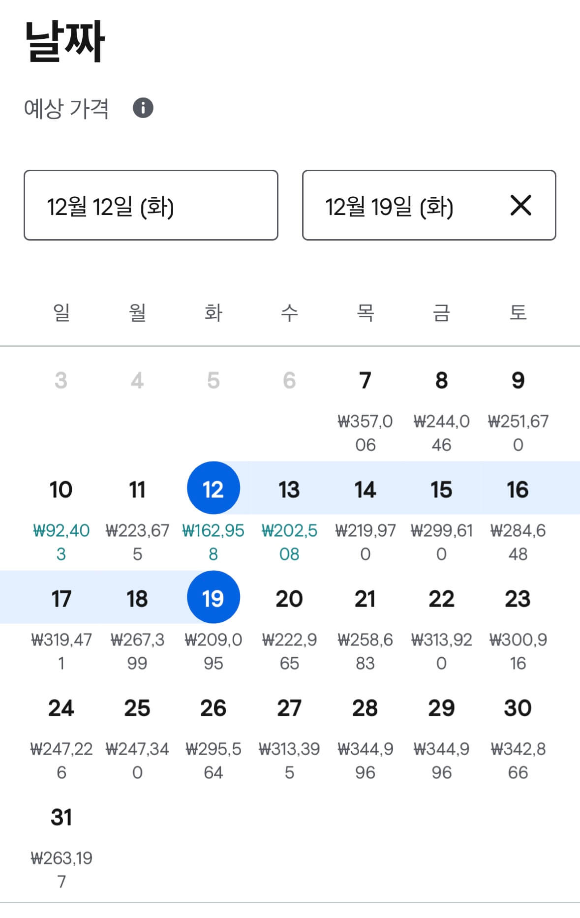 3. 날짜를 누르면 날짜별로 저렴한 가격을 볼 수 있습니다.